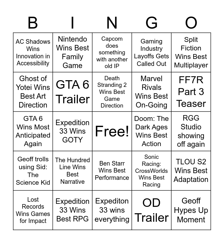 This bingo card has a free space and 24 words: The Hundred Line Wins Best Narrative, Expedition 33 Wins Best RPG, Death Stranding 2 Wins Best Game Direction, Lost Records Wins Games for Impact, Split Fiction Wins Best Multiplayer, AC Shadows Wins Innovation in Accessibility, Ghost of Yotei Wins Best Art Direction, Nintendo Wins Best Family Game, Doom: The Dark Ages Wins Best Action, Ben Starr Wins Best Performance, Marvel Rivals Wins Best On-Going, GTA 6 Wins Most Anticipated Again, Sonic Racing: CrossWorlds Wins Best Racing, TLOU S2 Wins Best Adaptation, GTA 6 Trailer, OD Trailer, RGG Studio showing off again, Capcom does something with another old IP, FF7R Part 3 Teaser, Expedition 33 Wins GOTY, Geoff Hypes Up Moment, Geoff trolls using Sid: The Science Kid, Gaming Industry Layoffs Gets Called Out and Expediton 33 wins everything.