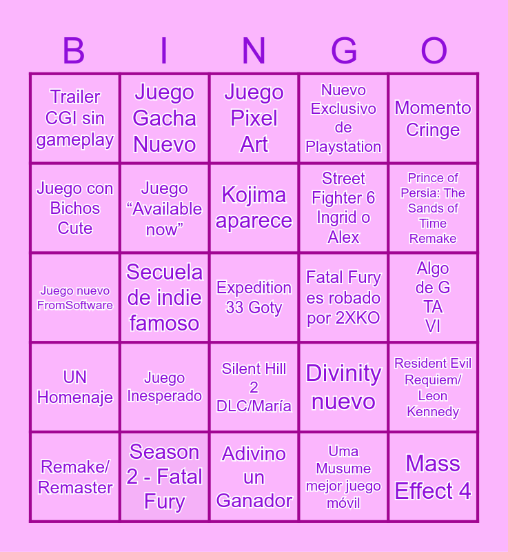This bingo card has a free space and 24 words: Juego Inesperado, Season 2 - Fatal Fury, Kojima aparece, Remake/ Remaster, Momento Cringe, Trailer CGI sin gameplay, Juego con Bichos Cute, Juego Gacha Nuevo, Fatal Fury es robado por 2XKO, Silent Hill 2 DLC/María, Street Fighter 6 Ingrid o Alex, Juego nuevo FromSoftware, Divinity nuevo, Resident Evil Requiem/ Leon Kennedy, Juego “Available now”, Uma Musume mejor juego móvil, Algo de GTA VI, Juego Pixel Art, Prince of Persia: The Sands of Time Remake, Secuela de indie famoso, Mass Effect 4, UN Homenaje, Nuevo Exclusivo de Playstation and Adivino un Ganador.