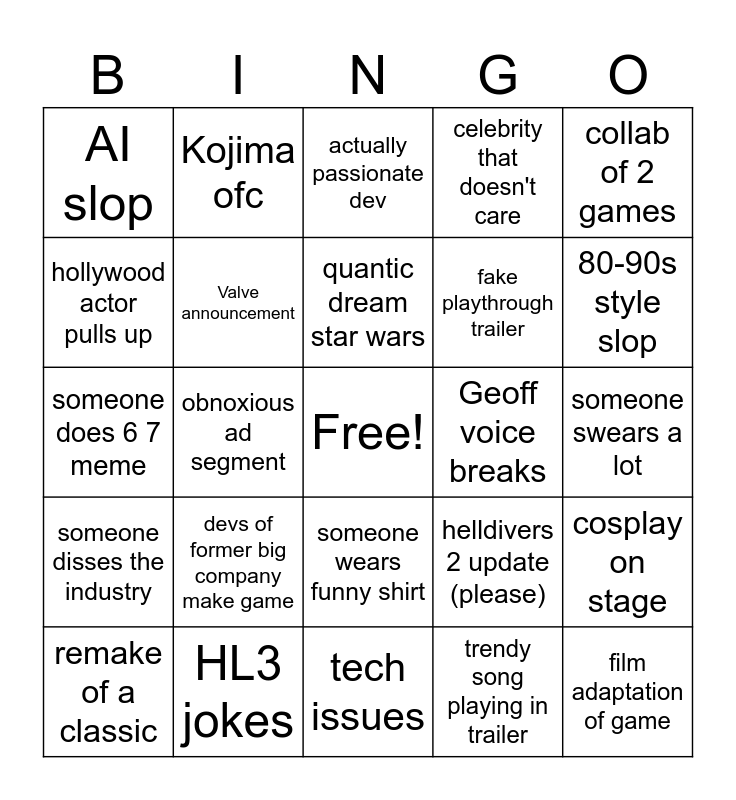 This bingo card has a free space and 24 words: devs of former big company make game, HL3 jokes, quantic dream star wars, remake of a classic, collab of 2 games, AI slop, hollywood actor pulls up, Kojima ofc, Geoff voice breaks, someone wears funny shirt, fake playthrough trailer, someone does 6 7 meme, helldivers 2 update (please), cosplay on stage, Valve announcement, trendy song playing in trailer, someone swears a lot, actually passionate dev, 80-90s style slop, obnoxious ad segment, film adaptation of game, someone disses the industry, celebrity that doesn't care and tech issues.