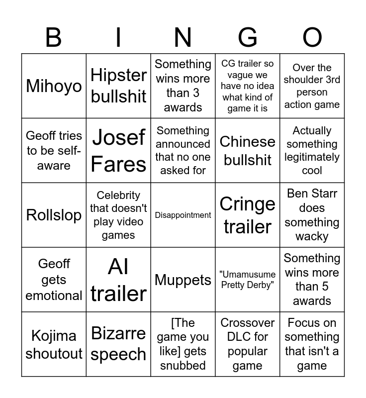 This bingo card has a free space and 24 words: AI trailer, Bizarre speech, Something announced that no one asked for, Kojima shoutout, Over the shoulder 3rd person action game, Mihoyo, Geoff tries to be self-aware, Hipster bullshit, Cringe trailer, Muppets, Chinese bullshit, Rollslop, "Umamusume Pretty Derby", Something wins more than 5 awards, Josef Fares, Crossover DLC for popular game, Ben Starr does something wacky, Something wins more than 3 awards, Actually something legitimately cool, Celebrity that doesn't play video games, Focus on something that isn't a game, Geoff gets emotional, CG trailer so vague we have no idea what kind of game it is and [The game you like] gets snubbed.