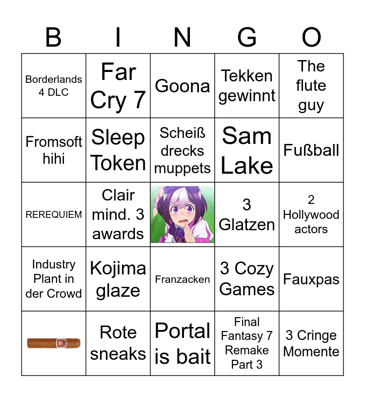 This bingo card has 1 images, a free space and 23 words: Kojima glaze, Rote sneaks, Scheiß drecks muppets, The flute guy, Borderlands 4 DLC, Fromsoft hihi, Far Cry 7, 3 Glatzen, Franzacken, Sam Lake, REREQUIEM, 3 Cozy Games, Fauxpas, Sleep Token, Final Fantasy 7 Remake Part 3, 2 Hollywood actors, Goona, Fußball, Clair mind. 3 awards, 3 Cringe Momente, Industry Plant in der Crowd, Tekken gewinnt and Portal is bait.