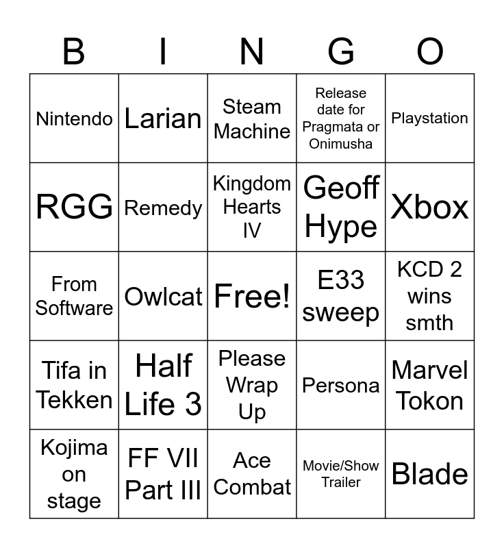 This bingo card has a free space and 24 words: Half Life 3, FF VII Part III, Kingdom Hearts IV, Kojima on stage, Playstation, Nintendo, RGG, Larian, E33 sweep, Please Wrap Up, Geoff Hype, From Software, Persona, Marvel Tokon, Remedy, Movie/Show Trailer, KCD 2 wins smth, Steam Machine, Xbox, Owlcat, Blade, Tifa in Tekken, Release date for Pragmata or Onimusha and Ace Combat.