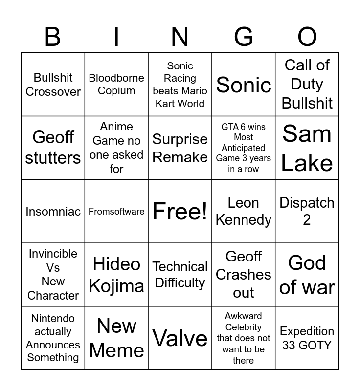 This bingo card has a free space and 24 words: Hideo Kojima, New Meme, Surprise Remake, Nintendo actually Announces Something, Call of Duty Bullshit, Bullshit Crossover, Geoff stutters, Bloodborne Copium, Leon Kennedy, Technical Difficulty, GTA 6 wins Most Anticipated Game 3 years in a row, Insomniac, Geoff Crashes out, God of war, Anime Game no one asked for, Awkward Celebrity that does not want to be there, Dispatch 2, Sonic Racing beats Mario Kart World, Sam Lake, Fromsoftware, Expedition 33 GOTY, Invincible Vs New Character, Sonic and Valve.