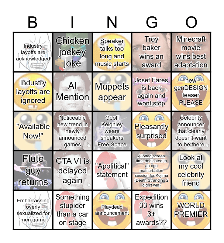 This bingo card has 24 images, a free space and 24 words: GTA VI is delayed again, Something stupider than a car on stage, Muppets appear, Embarrassing overly sexualized for men game, Minecraft movie wins best adaptation, Industry layoffs are acknowledged, Industry layoffs are ignored, Chicken jockey joke, Pleasantly surprised, "Apolitical" statement, Josef Fares is back again and wont stop, "Available Now!", Allotted screen time dedicated to an ego masturbation session for Kojima (Death Stranding 2 didn't win), Look at my cool celebrity friend, AI Mention, Expedition 33 wins 3+ awards??, Celebrity announcer that clearly doesn't want to be there, Speaker talks too long and music starts, new genDESIGN teaser PLEASE, Noticeable new trend in newly announced games, WORLD PREMIER, Flute guy returns, Troy baker wins an award and Playdead announcement.