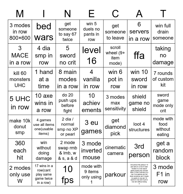 This bingo card has a free space and 49 words: 3rd person, ffa, parkour, 10 axe wins in a row, 8 main modes in a row, sword game mode only crit, bed wars, 10 fps, 6 servers in a row, 3 eu games, win full drain someone, win 5 duels no pants in row, win 10 sword in row, win 6 pot in row, win without doing damage, shield game no shield, 3 MACE in a row, taking no damage, get a random block, get someone to leave, scroll wheel (9+ item mode), do 20 push ups before fight, 3 modes in row 800×600, 4 dia smp in row, 2 modes only use W, 5 sword no crit, 7 rounds of custom kit, 17 wins in a row(cant play same game twice in a row), 4 vanilla in row, 1 hand at a time, min FOV, 3 modes max sensitivity, 360 each hit, 2 mode swap rmb & lmb, w & s, a & d, 5 UHC in row, get diamond pick, loot 4 structures, mode with food without eating, kill 60 monsters UHC, 2 dia / normal smp no XP or pearl, 3 mode inverted mouse, make 10k donut smp, 3 mode F1 in row, mode with 9 items only using 1, level 16, get someone to say 67 twice, cinematic camera, 4 games use all items one(usable items) and 3rd person ffa parkour 10 axe wins in a row 8 main modes in a row sword game mode only crit bed wars 10 fps 6 servers in a row 3 eu games win full drain someone win 5 duels no pants in row win 10 sword in row win 6 pot in row win without doing d.