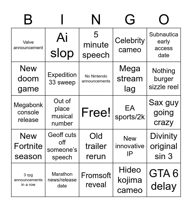 This bingo card has a free space and 24 words: Geoff cuts off someone’s speech, Marathon news/release date, No Nintendo announcements, 3 rpg announcements in a row, Subnautica early access date, Valve announcement, New doom game, Ai slop, EA sports/2k, Old trailer rerun, Mega stream lag, Megabonk console release, New innovative IP, Divinity original sin 3, Expedition 33 sweep, Hideo kojima cameo, Sax guy going crazy, 5 minute speech, Nothing burger sizzle reel, Out of place musical number, GTA 6 delay, New Fortnite season, Celebrity cameo and Fromsoft reveal.