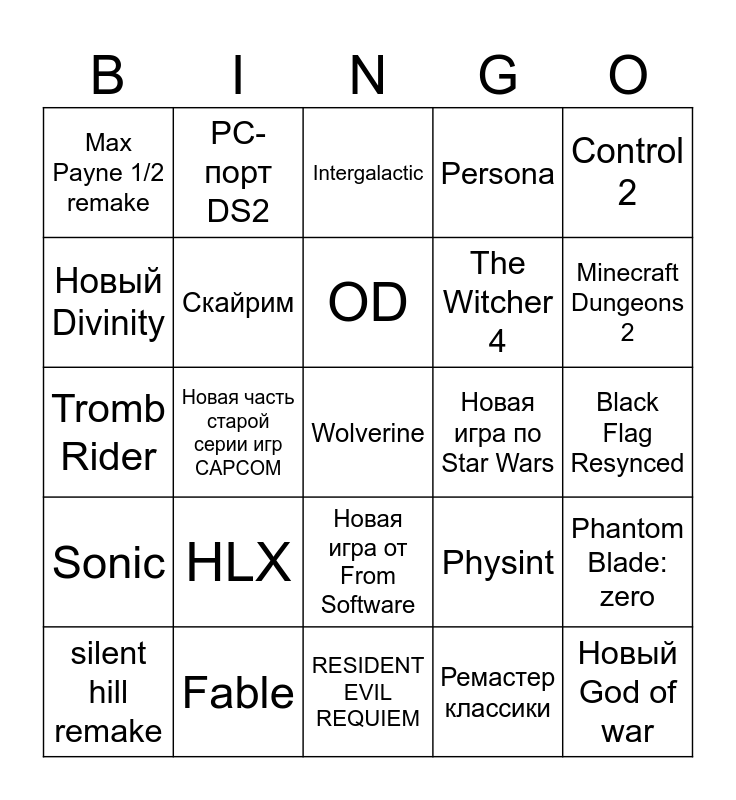 This bingo card has 25 words: HLX, RESIDENT EVIL REQUIEM, OD, silent hill remake, Control 2, Max Payne 1/2 remake, Новый Divinity, PC-порт DS2, Новая игра по Star Wars, Новая игра от From Software, The Witcher 4, Tromb Rider, Physint, Phantom Blade: zero, Скайрим, Новый God of war, Black Flag Resynced, Intergalactic, Minecraft Dungeons 2, Новая часть старой серии игр CAPCOM, Wolverine, Fable, Sonic, Persona and Ремастер классики.