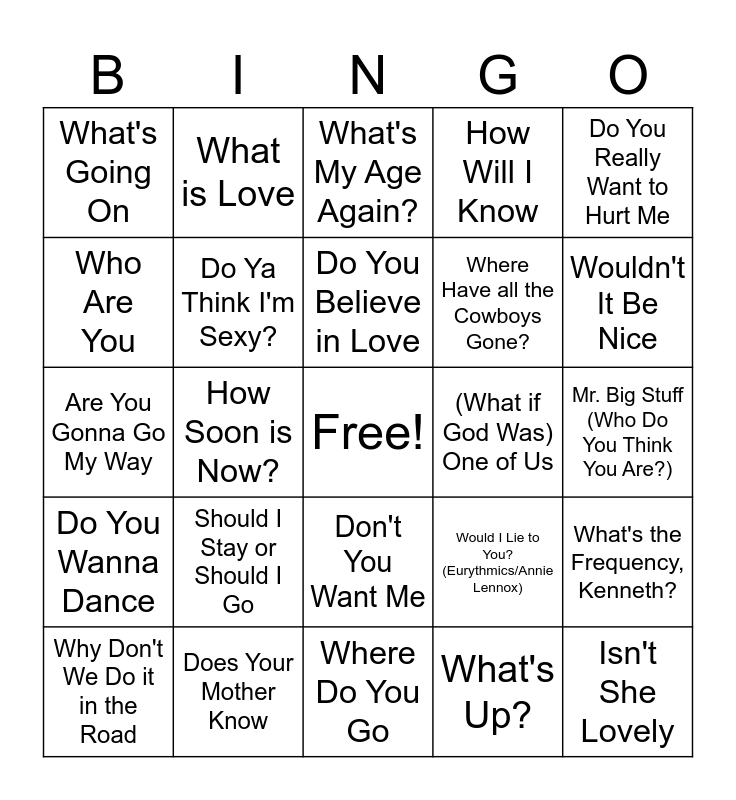 This bingo card has a free space and 40 words: Are You Gonna Be My Girl, Are You Gonna Go My Way, Are You That Somebody, Do Ya Think I'm Sexy?, Does Your Mother Know, Don't You Want Me, Do You Believe in Love, Do You Believe in Magic?, Do You Really Want to Hurt Me, Do You Wanna Dance, How Soon is Now?, How Will I Know, Isn't She Lovely, Mr. Big Stuff (Who Do You Think You Are?), (What if God Was) One of Us, Should I Stay or Should I Go, What Have You Done for Me Lately, What's Going On, What's Love Got to Do with It, What's My Age Again?, What's the Frequency, Kenneth?, What's Up?, Where Have all the Cowboys Gone?, Who Are You, Who Can it Be Now?, Who'll Stop the Rain, Who's Crying Now, Who's That Girl, Who Will Save Your Soul, Why Can't This Be Love, Why Can't We Be Friends, Why Don't We Do it in the Road, Would I Lie To You? (Charles & Eddie), Would I Lie to You? (Eurythmics/Annie Lennox), Wouldn't It Be Nice, Where Do You Go, What Becomes of the Brokenhearted, Why Do Fools Fall in Love?, What is Love and Where Did Our Love Go?.