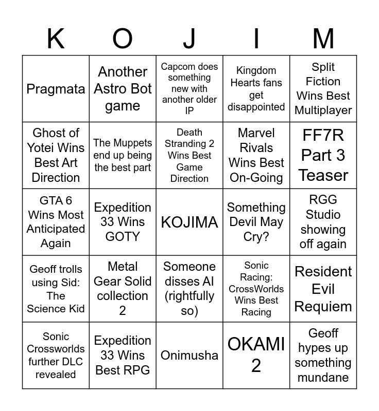 This bingo card has a free space and 24 words: Metal Gear Solid collection 2, Expedition 33 Wins Best RPG, Death Stranding 2 Wins Best Game Direction, Sonic Crossworlds further DLC revealed, Split Fiction Wins Best Multiplayer, Pragmata, Ghost of Yotei Wins Best Art Direction, Another Astro Bot game, Something Devil May Cry?, Someone disses AI (rightfully so), Marvel Rivals Wins Best On-Going, GTA 6 Wins Most Anticipated Again, Sonic Racing: CrossWorlds Wins Best Racing, Resident Evil Requiem, The Muppets end up being the best part, OKAMI 2, RGG Studio showing off again, Capcom does something new with another older IP, FF7R Part 3 Teaser, Expedition 33 Wins GOTY, Geoff hypes up something mundane, Geoff trolls using Sid: The Science Kid, Kingdom Hearts fans get disappointed and Onimusha.
