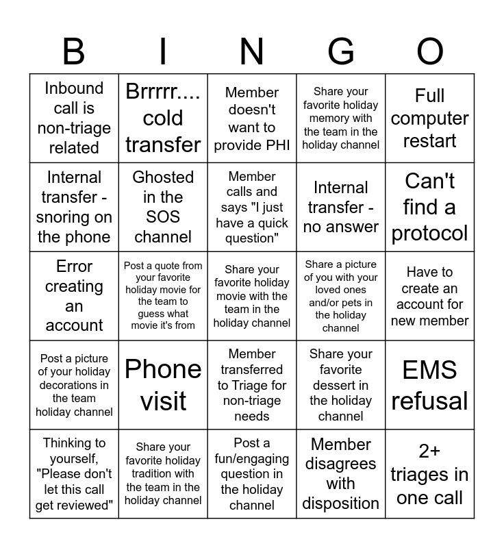 This bingo card has a free space and 44 words: Member calling for prescription, 2+ triages in one call, Inbound call right before break, Thinking to yourself, "Please don't let this call get reviewed", Have to call IT, Member disagrees with disposition, Member doesn't want to provide PHI, Forgot to change CXone status, Full computer restart, Share your favorite holiday tradition with the team in the holiday channel, Share your favorite holiday memory with the team in the holiday channel, Share a picture of you with your loved ones and/or pets in the holiday channel, Member transferred to Triage for non-triage needs, Phone visit, Change Slack picture to you wearing your favorite holiday outfit/sweater for the day, Post a fun/engaging question in the holiday channel, Silent Night (Silent Refused), Error creating an account, Refused status, Can't find a protocol, Brrrrr.... cold transfer, Talked a member through using telemedicine, VPN dropped, Inbound call is non-triage related, Caller found our number online, Have to create an account for new member, Multiple protocols in one triage case, Caller hangs up, Share your favorite dessert in the holiday channel, Post a picture of your holiday decorations in the team holiday channel, Post your favorite holiday recipe in the team holiday channel, EMS refusal, Member disagrees with care advice, Post a childhood picture of yourself during the holidays (in the holiday channel), Post a quote from your favorite holiday movie for the team to guess what movie it's from, Post the recipe you're famous for during the holidays, Member hung up on you, Cooking injury call, Member calls and says "I just have a quick question", Internal transfer - snoring on the phone, Internal transfer - no answer, Provider inappropriately uses ERT button, Ghosted in the SOS channel and Told SOS escalation was inappropriate.