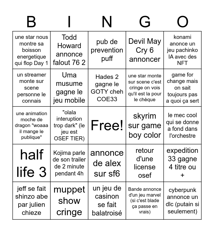 This bingo card has a free space and 24 words: Kojima parle de son trailer de 2 minute pendant 4h, muppet show cringe, Hades 2 gagne le GOTY cheh COE33, jeff se fait shinzo abe par julien chieze, konami anonce un jeu pachinko IA avec des NFT, une star nous montre sa boisson energetique qui flop Day 1, un streamer monte sur scene personne le connais, Todd Howard annonce falout 76 2, skyrim sur game boy color, annonce de alex sur sf6, une star monte sur scene c'est cringe on vois qu'il est la pour le chèque, une animation moche de dragon "woaaa il mange le publique", retour d'une license osef, expedition 33 gagne 4 titre ou +, Uma musume gagne le jeu mobile, Bande annonce d'un jeu marvel (si c'est blade ça passe en vrais), le mec cool qui se donne a fond dans l'orchestre, pub de prevention puff, game for change mais on sait toujours pas a quoi ça sert, "olala interuption trop dark" (le jeu est OSEF TIER), cyberpunk annonce un dlc (putain si seulement), half life 3, Devil May Cry 6 annoncer and un jeu de casinon se fait balatroisé.