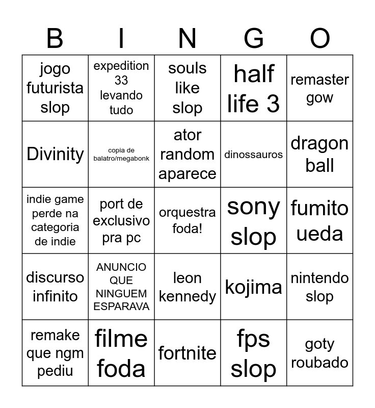 This bingo card has a free space and 24 words: ANUNCIO QUE NINGUEM ESPARAVA, filme foda, ator random aparece, remake que ngm pediu, remaster gow, jogo futurista slop, Divinity, expedition 33 levando tudo, sony slop, leon kennedy, dinossauros, indie game perde na categoria de indie, kojima, nintendo slop, copia de balatro/megabonk, fps slop, fumito ueda, souls like slop, dragon ball, port de exclusivo pra pc, goty roubado, discurso infinito, half life 3 and fortnite.