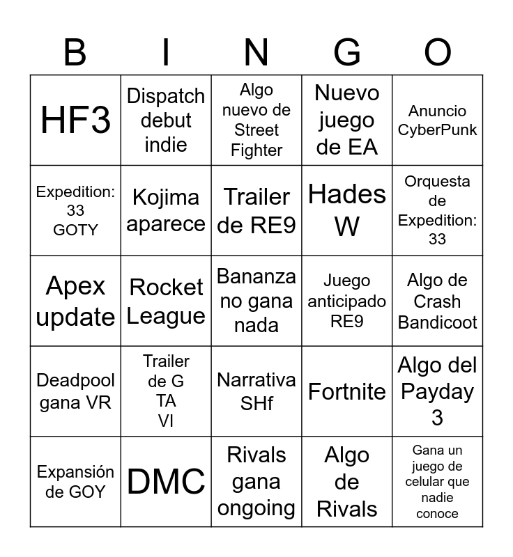 This bingo card has a free space and 24 words: Trailer de GTA VI, DMC, Trailer de RE9, Expansión de GOY, Anuncio CyberPunk, HF3, Expedition: 33 GOTY, Dispatch debut indie, Juego anticipado RE9, Narrativa SHf, Hades W, Apex update, Fortnite, Algo del Payday 3, Kojima aparece, Algo de Rivals, Algo de Crash Bandicoot, Algo nuevo de Street Fighter, Orquesta de Expedition: 33, Rocket League, Gana un juego de celular que nadie conoce, Deadpool gana VR, Nuevo juego de EA and Rivals gana ongoing.
