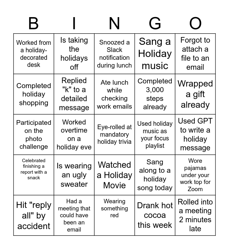This bingo card has a free space and 29 words: Set an OOO auto-reply this week, Had a meeting that could have been an email, Snoozed a Slack notification during lunch, Multitasked on a Zoom call, Forgot to attach a file to an email, Worked from a holiday-decorated desk, Replied "k" to a detailed message, Ate lunch while checking work emails, Used holiday music as your focus playlist, Wore pajamas under your work top for Zoom, Hit "reply all" by accident, Worked overtime on a holiday eve, Drank hot cocoa this week, Rolled into a meeting 2 minutes late, Wrapped a gift already, Has a pet in the room, Wearing something red, Sang along to a holiday song today, Wrapped a gift already, Celebrated finishing a report with a snack, Is wearing an ugly sweater, Has given up on the Wellness challenge, Completed 3,000 steps already, Used GPT to write a holiday message, Completed holiday shopping, Is taking the holidays off, Watched a Holiday Movie, Sang a Holiday music and Typed "Happy Holidays!" today.