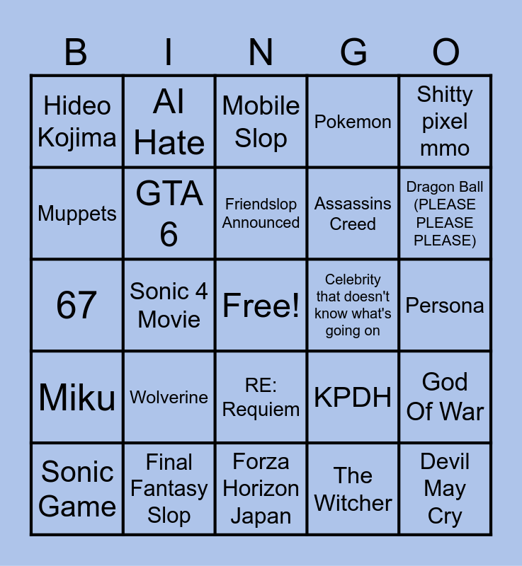 This bingo card has a free space and 24 words: Wolverine, Final Fantasy Slop, Friendslop Announced, Sonic Game, Shitty pixel mmo, Hideo Kojima, Muppets, AI Hate, Celebrity that doesn't know what's going on, RE: Requiem, Assassins Creed, 67, KPDH, God Of War, GTA 6, The Witcher, Persona, Mobile Slop, Dragon Ball (PLEASE PLEASE PLEASE), Sonic 4 Movie, Devil May Cry, Miku, Pokemon and Forza Horizon Japan.