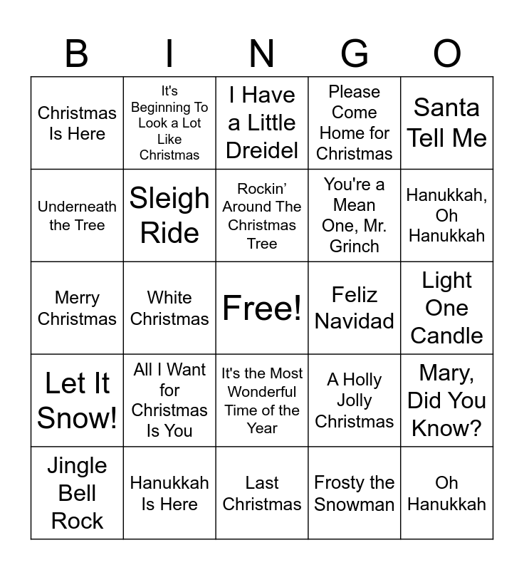 This bingo card has a free space and 25 words: All I Want for Christmas Is You, Last Christmas, Rockin’ Around The Christmas Tree, Jingle Bell Rock, Santa Tell Me, Christmas Is Here, Underneath the Tree, It's Beginning To Look a Lot Like Christmas, Feliz Navidad, It's the Most Wonderful Time of the Year, You're a Mean One, Mr. Grinch, Merry Christmas, A Holly Jolly Christmas, Mary, Did You Know?, Sleigh Ride, 8 Days (Of Hanukkah), Light One Candle, I Have a Little Dreidel, Hanukkah, Oh Hanukkah, White Christmas, Oh Hanukkah, Hanukkah Is Here, Let It Snow!, Please Come Home for Christmas and Frosty the Snowman.
