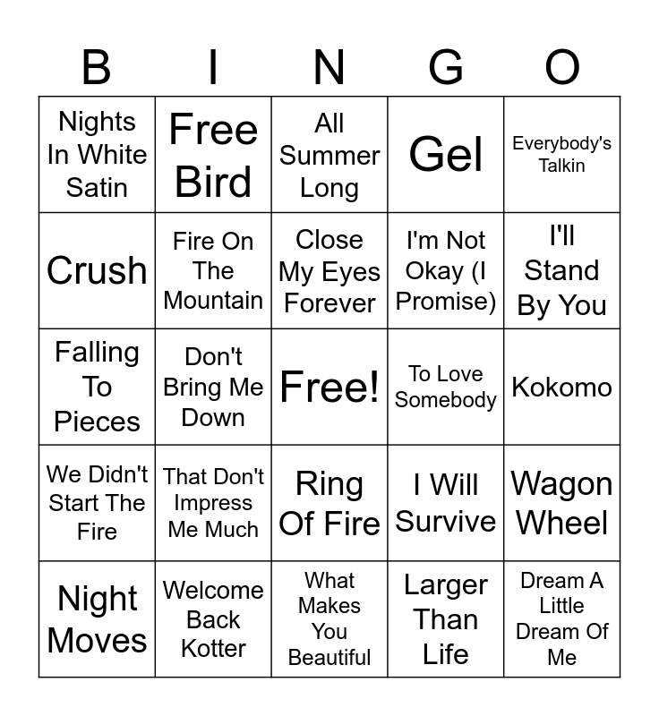 This bingo card has a free space and 75 words: A Change Is Gonna Come, A Thousand Years, All Summer Long, Big Spender, Boulevard Of Broken Songs, Brandy (You're A Fine Girl), Breakaway, Brian Wilson, Call Me The Breeze, Callin' Baton Rouge, Can't Fight The Moonlight, Centerfold, Close My Eyes Forever, Crush, Don't Ask Me Why, Don't Bring Me Down, Down On The Corner, Dream A Little Dream Of Me, Earth Angel (Will You Be Mine), Everybody's Talkin, Ex's and Oh's, Falling To Pieces, Fire On The Mountain, Free Bird, Gel, Gunpowder & Lead, Heaven Is A Place On Earth, Hey Baby, Hey Girl, Hit Me With Your Best Shot, Homeward Bound, Hooked On A Feeling, I Can See Clearly Now, I Will Survive, I'll Stand By You, I'm Not Okay (I Promise), It's Still Rock And Roll To Me, Just The Way You Are, Kokomo, Larger Than Life, Let's Go, Like A Prayer, Like A Stone, Lips Of An Angel, Loving You On My Mind, My Life, Night Moves, Nights In White Satin, Peter Pan, Pour Some Sugar On Me, Radio, Ring Of Fire, Save Me, Sloop John B, Snow (Hey Oh), Sober (Soul Funk), Soulshine, Sugar Mountain, Surfin' Bird, Take It Easy, That Don't Impress Me Much, That Summer, The Ballad Of Billy The Kid, The Devil Went Down To Georgi, The Sound Of Silence, To Love Somebody, Toes, Tomorrow, Vicarious, Wagon Wheel, We Didn't Start The Fire, Welcome Back Kotter, Welcome To My Life, What Makes You Beautiful and Cult Of Personality.