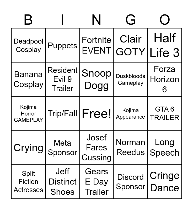 This bingo card has a free space and 24 words: Meta Sponsor, Jeff Distinct Shoes, Snoop Dogg, Split Fiction Actresses, Half Life 3, Deadpool Cosplay, Banana Cosplay, Puppets, Kojima Appearance, Josef Fares Cussing, Duskbloods Gameplay, Kojima Horror GAMEPLAY, Norman Reedus, Long Speech, Resident Evil 9 Trailer, Discord Sponsor, GTA 6 TRAILER, Fortnite EVENT, Forza Horizon 6, Trip/Fall, Cringe Dance, Crying, Clair GOTY and Gears E Day Trailer.