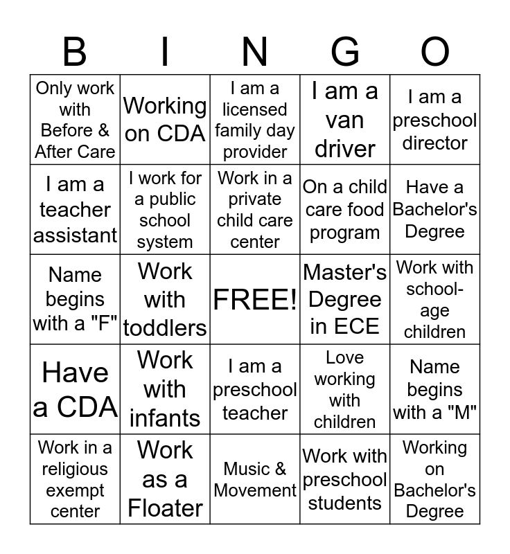This bingo card has a free space and 24 words: Work with infants, Work as a Floater, Work in a private child care center, Work in a religious exempt center, I am a preschool director, Only work with Before & After Care, I am a teacher assistant, Working on CDA, Master's Degree in ECE, I am a preschool teacher, On a child care food program, Name begins with a "F", Love working with children, Name begins with a "M", I work for a public school system, Work with preschool students, Work with school-age children, I am a licensed family day provider, Have a Bachelor's Degree, Work with toddlers, Working on Bachelor's Degree, Have a CDA, I am a van driver and Music & Movement.