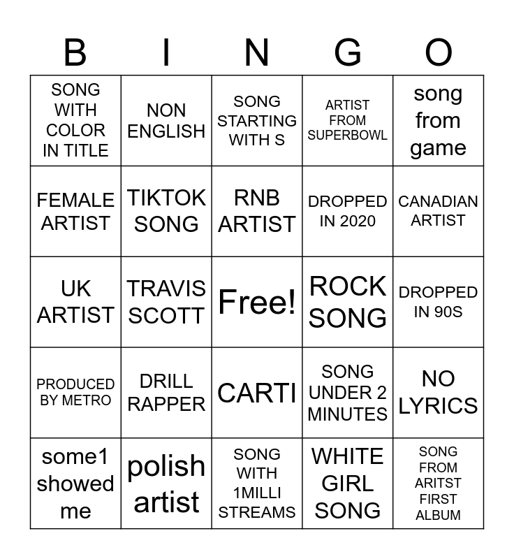 This bingo card has a free space and 24 words: DRILL RAPPER, polish artist, RNB ARTIST, some1 showed me, song from game, SONG WITH COLOR IN TITLE, FEMALE ARTIST, NON ENGLISH, ROCK SONG, CARTI, DROPPED IN 2020, UK ARTIST, SONG UNDER 2 MINUTES, NO LYRICS, TIKTOK SONG, WHITE GIRL SONG, DROPPED IN 90S, SONG STARTING WITH S, CANADIAN ARTIST, TRAVIS SCOTT, SONG FROM ARITST FIRST ALBUM, PRODUCED BY METRO, ARTIST FROM SUPERBOWL and SONG WITH 1MILLI STREAMS.