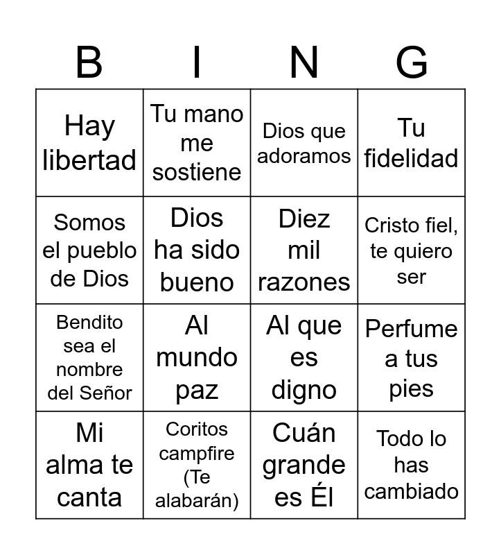 This bingo card has 31 words: Free!, La Casa de Dios, Perfume a tus pies, Cristo no está muerto, Hay libertad, Dios que adoramos, Diez mil razones, Santo por siempre, Coritos campfire (Te alabarán), Así como David danzaba, Cuán grande es Él, Mi alma te canta, A quién iré, Bajo la sombra de un arbolito, Al mundo paz, La bondad de Dios, Grande en amor, Él es el Rey, Todo lo has cambiado, Dame tu victoria, Somos el pueblo de Dios, Con mi Dios, Oh morada de Sión, Tu mano me sostiene, Bendito sea el nombre del Señor, Dios ha sido bueno, Tu fidelidad, Al que es digno, Que mi vida entera esté, Cristo fiel, te quiero ser and Hallé un buen amigo.