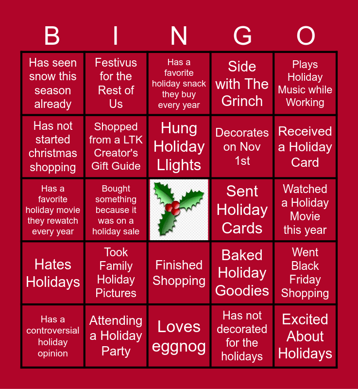 This bingo card has a free space and 29 words: Has a controversial holiday opinion, Prefers Thanksgiving, Bought something because it was on a holiday sale, Listened to a Holiday Song this week, Has seen snow this season already, Has a favorite holiday snack they buy every year, Shopped from a LTK Creator's Gift Guide, Took Family Holiday Pictures, Sent Holiday Cards, Attending a Holiday Party, Watched a Holiday Movie this year, Excited About Holidays, Loves eggnog, Has not decorated for the holidays, Received a Holiday Card, Wrapped Presents, Finished Shopping, Hates Holidays, Plays Holiday Music while Working, Has a favorite holiday movie they rewatch every year, Baked Holiday Goodies, Saved a Holiday recipe from TikTok, Decorates on Nov 1st, Has not started christmas shopping, Side with The Grinch, Festivus for the Rest of Us, Went Black Friday Shopping, Hung Holiday Llights and Taking PTO.