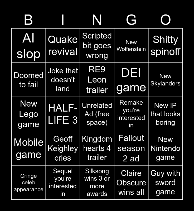 This bingo card has a free space and 29 words: Cringe celeb appearance, Hideo Kojima walks on stage, HALF-LIFE 3, r/Silksong reference, AI slop, Scripted bit goes wrong, Joke that doesn't land, Geoff Keighley cries, Remake you're interested in, Sequel you're interested in, New IP that looks boring, Guy with sword game, Silksong wins 3 or more awards, Claire Obscure wins all, New Skylanders, Elder Scrolls 6 trailer, Kingdom hearts 4 trailer, Mobile game, Shitty spinoff, New Lego game, Fallout season 2 ad, 67 mention, DEI game, Doomed to fail, New Wolfenstein, Quake revival, New Nintendo game, RE9 Leon trailer and MH wilds DLC.