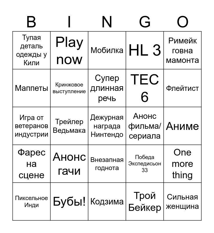 This bingo card has 25 words: Анонс гачи, Кодзима, Супер длинная речь, Пиксельное Инди, Римейк говна мамонта, Тупая деталь одежды у Кили, Маппеты, Play now, Анонс фильма/сериала, Внезапная годнота, ТЕС 6, Игра от ветеранов индустрии, Победа Экспедисьон 33, One more thing, Кринжовое выступление, Сильная женщина, Аниме, Мобилка, Флейтист, Трейлер Ведьмака, Дежурная награда Нинтендо, Бубы!, Фарес на сцене, HL 3 and Трой Бейкер.