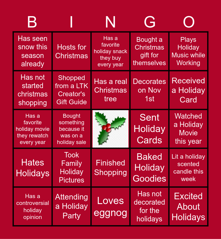 This bingo card has a free space and 29 words: Has a controversial holiday opinion, Prefers Thanksgiving, Bought something because it was on a holiday sale, Listened to a Holiday Song this week, Has seen snow this season already, Has a favorite holiday snack they buy every year, Shopped from a LTK Creator's Gift Guide, Took Family Holiday Pictures, Sent Holiday Cards, Attending a Holiday Party, Watched a Holiday Movie this year, Excited About Holidays, Loves eggnog, Has not decorated for the holidays, Received a Holiday Card, Wrapped Presents, Finished Shopping, Hates Holidays, Plays Holiday Music while Working, Has a favorite holiday movie they rewatch every year, Baked Holiday Goodies, Saved a Holiday recipe from TikTok, Decorates on Nov 1st, Has not started christmas shopping, Bought a Christmas gift for themselves, Hosts for Christmas, Lit a holiday scented candle this week, Has a real Christmas tree and Has a holiday song stuck in your head.