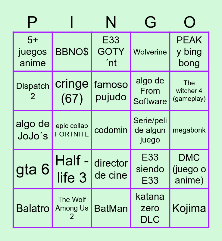 This bingo card has a free space and 24 words: Balatro, Half - life 3, famoso pujudo, katana zero DLC, PEAK y bing bong, 5+ juegos anime, BBNO$, E33 GOTY´nt, Serie/peli de algun juego, megabonk, algo de JoJo´s, cringe (67), E33 siendo E33, DMC (juego o anime), Dispatch 2, The Wolf Among Us 2, BatMan, Wolverine, The witcher 4 (gameplay), gta 6, epic collab FORTNITE, director de cine, algo de From Software and Kojima.