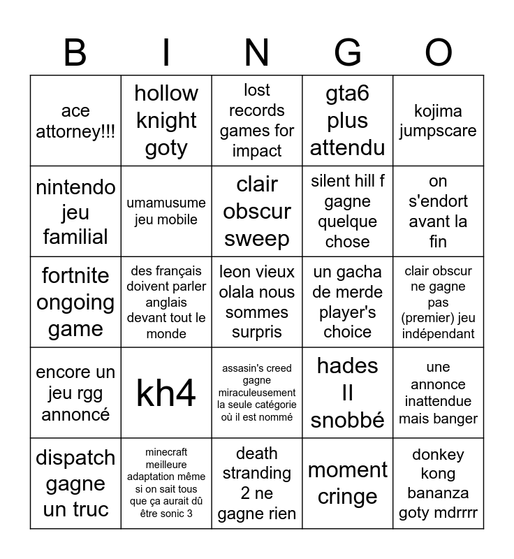 This bingo card has a free space and 24 words: dispatch gagne un truc, kh4, clair obscur sweep, moment cringe, kojima jumpscare, ace attorney!!!, hollow knight goty, lost records games for impact, un gacha de merde player's choice, clair obscur ne gagne pas (premier) jeu indépendant, fortnite ongoing game, umamusume jeu mobile, hades II snobbé, une annonce inattendue mais banger, nintendo jeu familial, minecraft meilleure adaptation même si on sait tous que ça aurait dû être sonic 3, death stranding 2 ne gagne rien, gta6 plus attendu, on s'endort avant la fin, encore un jeu rgg annoncé, des français doivent parler anglais devant tout le monde, assasin's creed gagne miraculeusement la seule catégorie où il est nommé, silent hill f gagne quelque chose and donkey kong bananza goty mdrrrr.