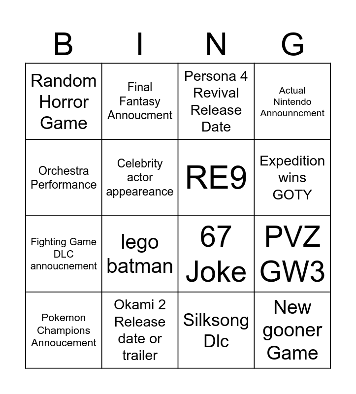 This bingo card has 16 words: Okami 2 Release date or trailer, PVZ GW3, Persona 4 Revival Release Date, Random Horror Game, Fighting Game DLC annoucnement, Final Fantasy Annoucment, 67 Joke, Silksong Dlc, Orchestra Performance, Celebrity actor appeareance, Pokemon Champions Annoucement, Actual Nintendo Announncment, lego batman, Expedition wins GOTY, RE9 and New gooner Game.