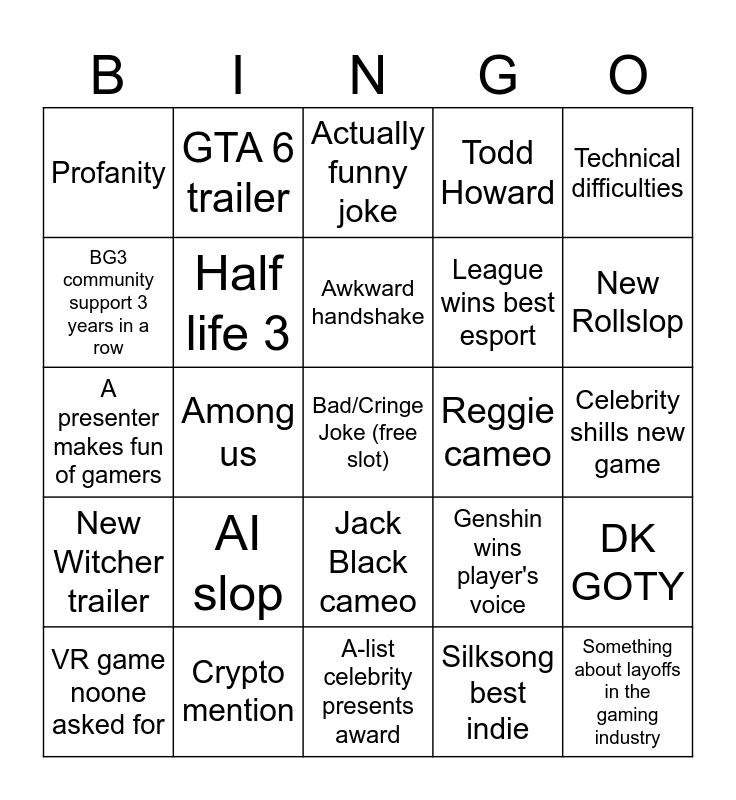 This bingo card has a free space and 51 words: "My good friend Hideo Kojima", Something about layoffs in the gaming industry, Game name is misspronounced, A-list celebrity presents award, AI slop, "World premiere", GTA 6 trailer, E33 sweep - (5 or more), BG3 community support 3 years in a row, New video game movie/tv series, Half life 3, Todd Howard, DK GOTY, Genshin wins player's voice, Some random remake no one asked for, Death stranding wins a single award, Awkward handshake, Reggie cameo, Minecraft movie wins best adaptation, Technical difficulties, Among us, Silksong best indie, Profanity, League wins best esport, Audience gets baited, 5 minute speech, New Rollslop, AAA Friendslop, VR game noone asked for, Actually funny joke, Best VA jokes about speech length, Actual hype announcment, New Bill Clinton incident, Divinity 3, "in engine footage", Crypto mention, Muppets roast Geoff Keighley, What is this game about type trailer, New card game announced, Geoff Keighley glazes himself, Celebrity shills new game, New Witcher trailer, "Game releasing right now", Nintendo wins nothing, You can clearly explain what Kojima's new game is about, New ResE remake, A presenter makes fun of gamers, New gachaslop trailer, Political statement, Jack Black cameo and Geoff Keighley cries.
