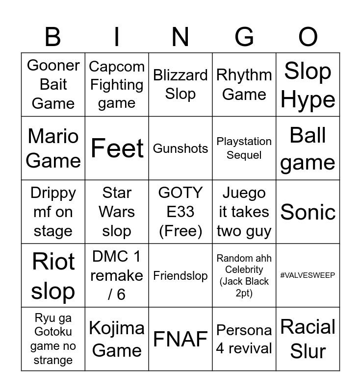 This bingo card has a free space and 24 words: DMC 1 remake / 6, Kojima Game, Gunshots, Ryu ga Gotoku game no strange, Slop Hype, Gooner Bait Game, Mario Game, Capcom Fighting game, Juego it takes two guy, Friendslop, Playstation Sequel, Drippy mf on stage, Random ahh Celebrity (Jack Black 2pt), #VALVESWEEP, Feet, Persona 4 revival, Sonic, Blizzard Slop, Ball game, Star Wars slop, Racial Slur, Riot slop, Rhythm Game and FNAF.