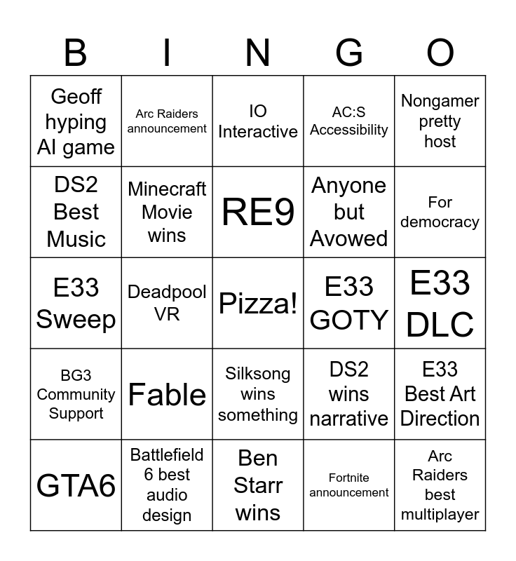 This bingo card has a free space and 24 words: GTA6, Fable, RE9, Fortnite announcement, Nongamer pretty host, Geoff hyping AI game, Arc Raiders announcement, IO Interactive, E33 GOTY, E33 DLC, E33 Sweep, Minecraft Movie wins, DS2 wins narrative, E33 Best Art Direction, DS2 Best Music, Battlefield 6 best audio design, Ben Starr wins, AC:S Accessibility, For democracy, BG3 Community Support, Deadpool VR, Silksong wins something, Anyone but Avowed and Arc Raiders best multiplayer.