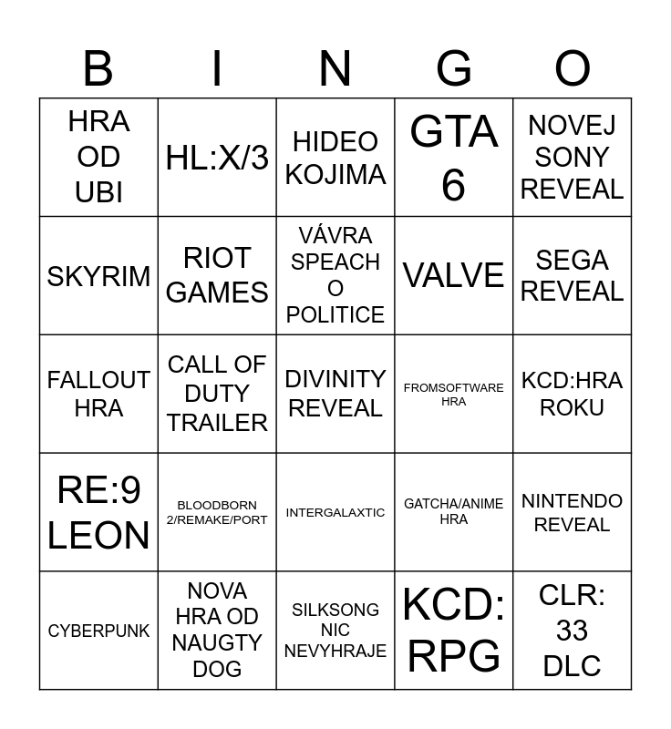 This bingo card has a free space and 24 words: BLOODBORN 2/REMAKE/PORT, NOVA HRA OD NAUGTY DOG, VÁVRA SPEACH O POLITICE, CYBERPUNK, NOVEJ SONY REVEAL, HRA OD UBI, SKYRIM, HL:X/3, FROMSOFTWARE HRA, INTERGALAXTIC, VALVE, FALLOUT HRA, GATCHA/ANIME HRA, NINTENDO REVEAL, RIOT GAMES, KCD: RPG, KCD:HRA ROKU, HIDEO KOJIMA, SEGA REVEAL, CALL OF DUTY TRAILER, CLR: 33 DLC, RE:9 LEON, GTA 6 and SILKSONG NIC NEVYHRAJE.