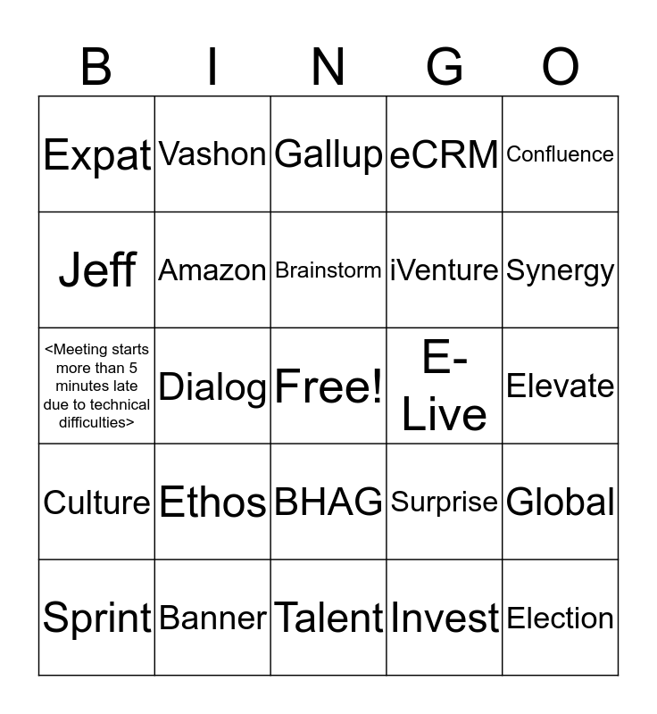 This bingo card has a free space and 40 words: <A sports analogy>, <Meeting starts more than 5 minutes late due to technical difficulties>, Agile, Amazon, Banner, BHAG, Brainstorm, Cloud, Confluence, Culture, Dialog, eCRM, Election, Elevate, E-Live, Ethos, Excitement, Expat, Follow the sun, Gallup, Global, Invest, iVenture, Jeff, Leverage, Merit, Purple, Record-setting, Retirement, San Francisco, Slack, Sprint, Strategy, Surprise, Synergy, Talent, TPG, True North, Vashon and World class.