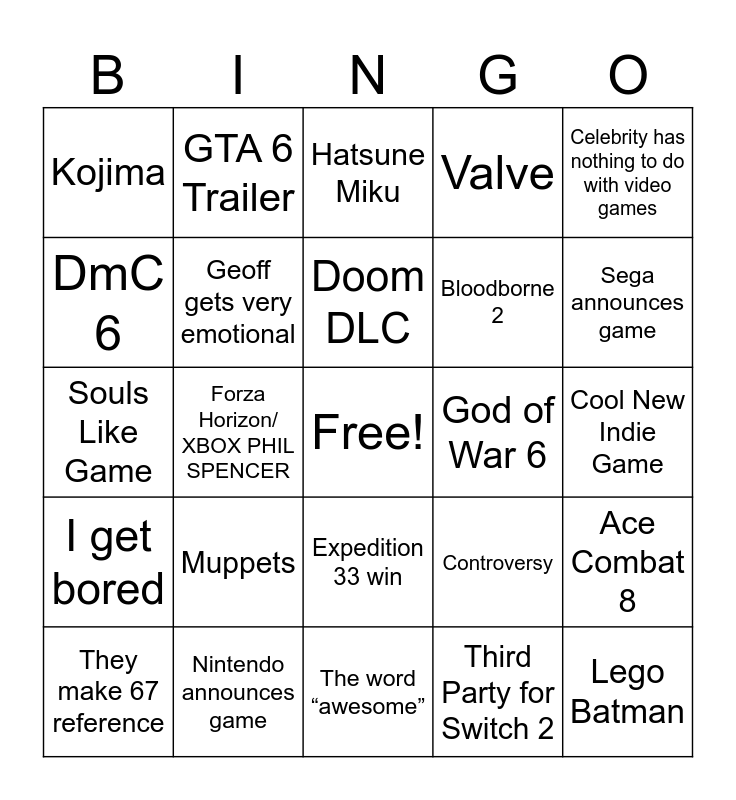 This bingo card has a free space and 24 words: Muppets, Nintendo announces game, Doom DLC, They make 67 reference, Celebrity has nothing to do with video games, Kojima, DmC 6, GTA 6 Trailer, God of War 6, Expedition 33 win, Bloodborne 2, Souls Like Game, Controversy, Ace Combat 8, Geoff gets very emotional, Third Party for Switch 2, Cool New Indie Game, Hatsune Miku, Sega announces game, Forza Horizon/ XBOX PHIL SPENCER, Lego Batman, I get bored, Valve and The word “awesome”.