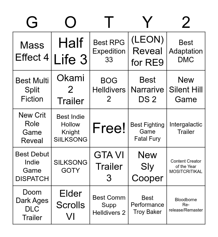 This bingo card has a free space and 24 words: SILKSONG GOTY, Elder Scrolls VI, BOG Helldivers 2, Doom Dark Ages DLC Trailer, Best Adaptation DMC, Mass Effect 4, Best Multi Split Fiction, Half Life 3, Best Fighting Game Fatal Fury, GTA VI Trailer 3, Best Narrarive DS 2, New Crit Role Game Reveal, New Sly Cooper, Content Creator of the Year MOSITCRITIKAL, Okami 2 Trailer, Best Performance Troy Baker, Intergalactic Trailer, Best RPG Expedition 33, New Silent Hill Game, Best Indie Hollow Knight SiILKSONG, Bloodborne Re-release/Remaster, Best Debut Indie Game DISPATCH, (LEON) Reveal for RE9 and Best Comm Supp Helldivers 2.