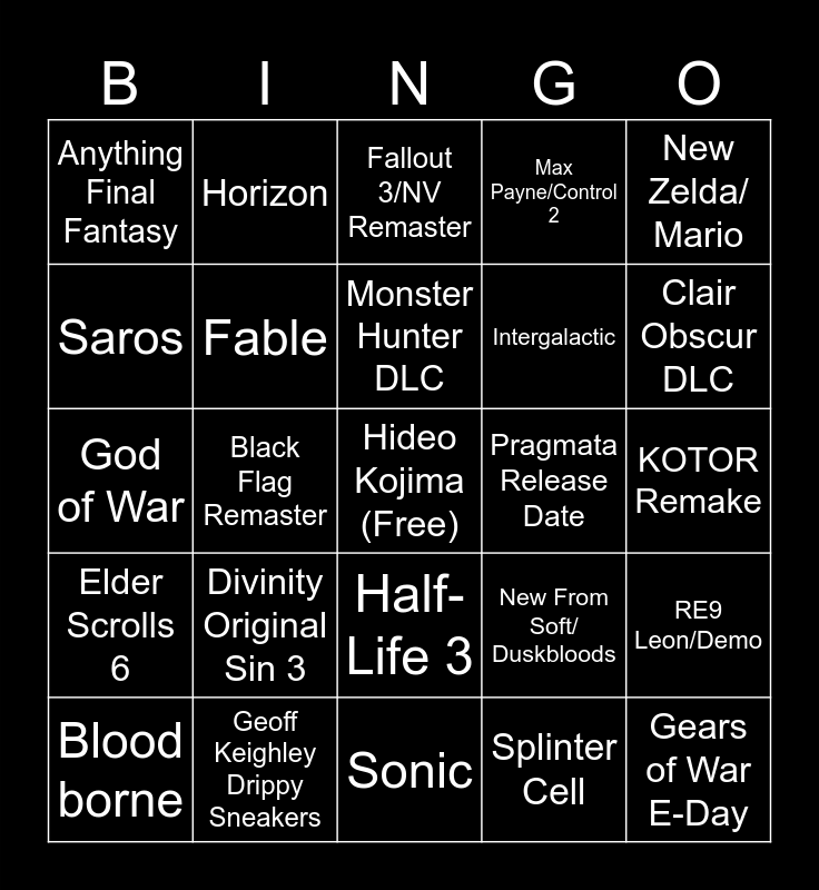 This bingo card has a free space and 24 words: Divinity Original Sin 3, Geoff Keighley Drippy Sneakers, Monster Hunter DLC, Blood borne, New Zelda/ Mario, Anything Final Fantasy, Saros, Horizon, Pragmata Release Date, Half-Life 3, Intergalactic, God of War, New From Soft/ Duskbloods, RE9 Leon/Demo, Fable, Splinter Cell, KOTOR Remake, Fallout 3/NV Remaster, Clair Obscur DLC, Black Flag Remaster, Gears of War E-Day, Elder Scrolls 6, Max Payne/Control 2 and Sonic.