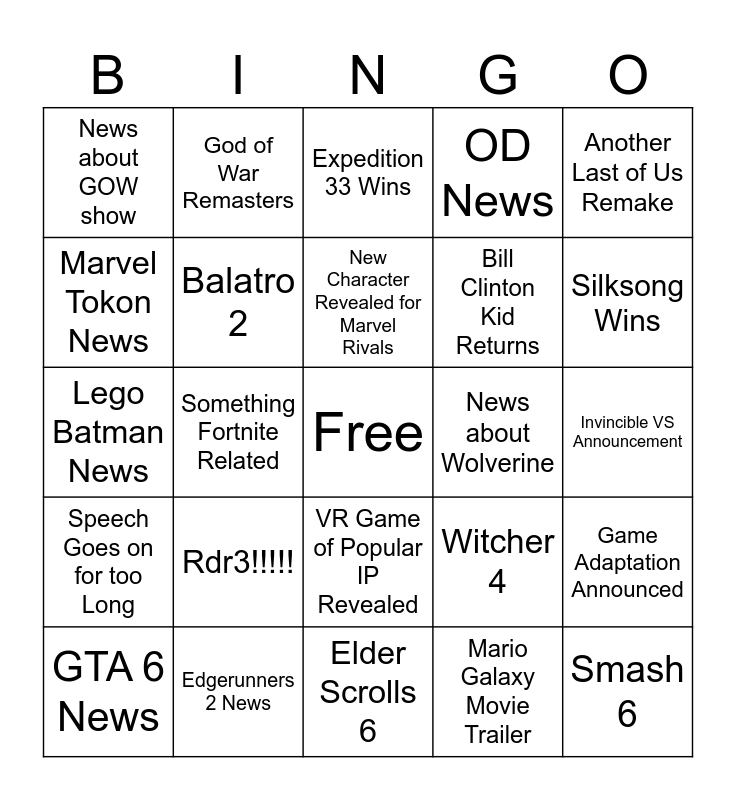 This bingo card has a free space and 24 words: Rdr3!!!!!, Edgerunners 2 News, New Character Revealed for Marvel Rivals, GTA 6 News, Another Last of Us Remake, News about GOW show, Marvel Tokon News, God of War Remasters, News about Wolverine, VR Game of Popular IP Revealed, Bill Clinton Kid Returns, Lego Batman News, Witcher 4, Game Adaptation Announced, Balatro 2, Mario Galaxy Movie Trailer, Invincible VS Announcement, Expedition 33 Wins, Silksong Wins, Something Fortnite Related, Smash 6, Speech Goes on for too Long, OD News and Elder Scrolls 6.