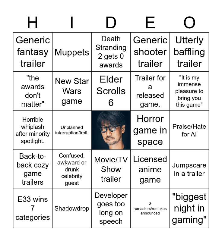 This bingo card has a free space and 24 words: Confused, awkward or drunk celebrity guest, Shadowdrop, Elder Scrolls 6, E33 wins 7 categories, Utterly baffling trailer, Generic fantasy trailer, "the awards don't matter", Muppets, Horror game in space, Movie/TV Show trailer, Trailer for a released game., Horrible whiplash after minority spotlight., Licensed anime game, Jumpscare in a trailer, New Star Wars game, 3 remasters/remakes announced, Praise/Hate for AI, Death Stranding 2 gets 0 awards, "It is my immense pleasure to bring you this game", Unplanned interruption/troll., "biggest night in gaming", Back-to-back cozy game trailers, Generic shooter trailer and Developer goes too long on speech.