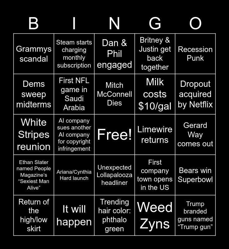 This bingo card has a free space and 24 words: Ariana/Cynthia Hard launch, It will happen, Mitch McConnell Dies, Return of the high/low skirt, Recession Punk, Grammys scandal, Dems sweep midterms, Steam starts charging monthly subscription, Limewire returns, Unexpected Lollapalooza headliner, Milk costs $10/gal, White Stripes reunion, First company town opens in the US, Bears win Superbowl, First NFL game in Saudi Arabia, Weed Zyns, Gerard Way comes out, Dan & Phil engaged, Dropout acquired by Netflix, AI company sues another AI company for copyright infringement, Trump branded guns named “Trump gun”, Ethan Slater named People Magazine’s “Sexiest Man Alive”, Britney & Justin get back together and Trending hair color: phthalo green.