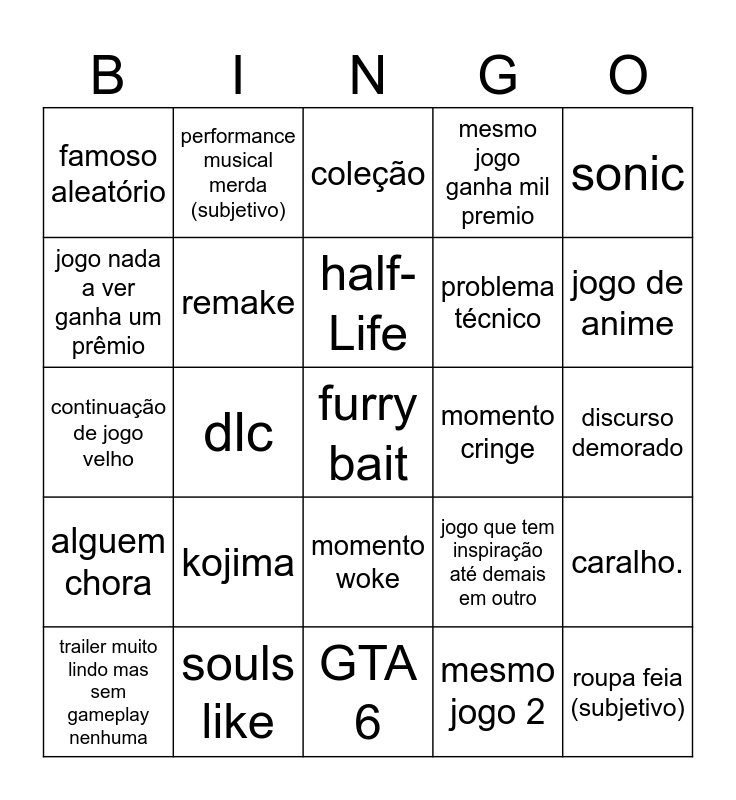 This bingo card has 25 words: kojima, GTA 6, half-Life, trailer muito lindo mas sem gameplay nenhuma, sonic, famoso aleatório, jogo nada a ver ganha um prêmio, performance musical merda (subjetivo), momento cringe, momento woke, problema técnico, continuação de jogo velho, jogo que tem inspiração até demais em outro, caralho., remake, roupa feia (subjetivo), discurso demorado, coleção, jogo de anime, dlc, furry bait, souls like, alguem chora, mesmo jogo ganha mil premio and mesmo jogo 2.
