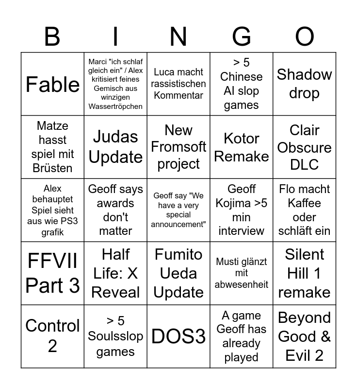 This bingo card has a free space and 24 words: Half Life: X Reveal, > 5 Soulsslop games, New Fromsoft project, Control 2, Shadow drop, Fable, Matze hasst spiel mit Brüsten, Marci "ich schlaf gleich ein" / Alex kritisiert feines Gemisch aus winzigen Wassertröpchen, Geoff Kojima >5 min interview, Fumito Ueda Update, Kotor Remake, Alex behauptet Spiel sieht aus wie PS3 grafik, Musti glänzt mit abwesenheit, Silent Hill 1 remake, Judas Update, A game Geoff has already played, Flo macht Kaffee oder schläft ein, Luca macht rassistischen Kommentar, Clair Obscure DLC, Geoff says awards don't matter, Beyond Good & Evil 2, FFVII Part 3, > 5 Chinese AI slop games and DOS3.