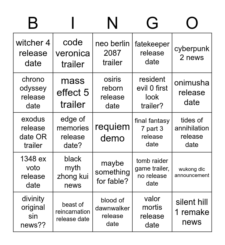 This bingo card has a free space and 24 words: divinity original sin news??, black myth zhong kui news, osiris reborn release date, valor mortis release date, cyberpunk 2 news, witcher 4 release date, code veronica trailer, neo berlin 2087 trailer, final fantasy 7 part 3 release date, tides of annihilation release date, exodus release date OR trailer, mass effect 5 trailer, tomb raider game trailer, no release date, wukong dlc announcement, chrono odyssey release date, beast of reincarnation release date, blood of dawnwalker release date, fatekeeper release date, onimusha release date, 1348 ex voto release date, edge of memories release date?, maybe something for fable?, resident evil 0 first look trailer? and silent hill 1 remake news.