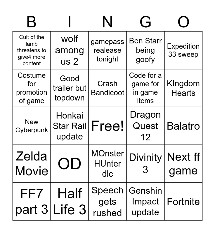 This bingo card has a free space and 24 words: OD, Half Life 3, Crash Bandicoot, FF7 part 3, Expedition 33 sweep, Cult of the lamb threatens to give4 more content, Costume for promotion of game, wolf among us 2, Dragon Quest 12, MOnster HUnter dlc, Code for a game for in game items, New Cyberpunk, Divinity 3, Next ff game, Good trailer but topdown, Genshin Impact update, Balatro, gamepass realease tonight, KIngdom Hearts, Honkai Star Rail update, Fortnite, Zelda Movie, Ben Starr being goofy and Speech gets rushed.