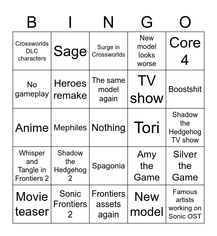 This bingo card has a free space and 24 words: Shadow the Hedgehog 2, Sonic Frontiers 2, The same model again, Movie teaser, Core 4, Crossworlds DLC characters, No gameplay, Sage, Tori, Spagonia, TV show, Anime, Amy the Game, Silver the Game, Heroes remake, New model, Shadow the Hedgehog TV show, Surge in Crossworlds, Boostshit, Mephiles, Famous artists working on Sonic OST, Whisper and Tangle in Frontiers 2, New model looks worse and Frontiers assets again.