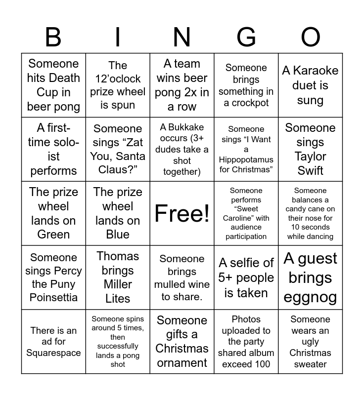 This bingo card has a free space and 59 words: Someone gets 6+ people to do a perfectly timed “wave” across the room, Someone spins around 5 times, then successfully lands a pong shot, Someone sings Six White Boomers, Someone sings Percy the Puny Poinsettia, Photos uploaded to the party shared album exceed 100, A performer incorporates a musical instrument into their song, Someone sings “Zat You, Santa Claus?”, Someone sings “Nuttin’ for Christmas”, Someone sings “I Want a Hippopotamus for Christmas”, Someone sings “Dominick the Donkey” with exaggerated animal sounds., Someone brings something in a crockpot, Someone sings a 90s song, A first-time solo-ist performs, It starts to snow, Someone sings “Take Me Home Country Roads”, Someone hits Death Cup in beer pong, Someone wears an ugly Christmas sweater, A Karaoke duet is sung, A group of 4+ sings a song, A Bukkake occurs (3+ dudes take a shot together), Someone performs “Sweet Caroline” with audience participation, A team wins beer pong 2x in a row, There is an ad for Squarespace, A guest brings eggnog, A guest wears Christmas themed socks, A guest brings a Santa hat, A song performance involves backup dancers, A group starts a conga line during a song, Someone sings Taylor Swift, The 7’oclock prize wheel is spun, The 8’oclock prize wheel is spun, The 9’oclock prize wheel is spun, The 10’oclock prize wheel is spun, The 11’oclock prize wheel is spun, The 12’oclock prize wheel is spun, The prize wheel lands on “Spin Again”, The prize wheel lands on Yellow, The prize wheel lands on Blue, The prize wheel lands on Red, The prize wheel lands on Green, Someone sings “Rattlesnake”, Thomas brings Miller Lites, Someone balances a candy cane on their nose for 10 seconds while dancing, A guest brings brownies, Someone sings "Mr. Brightside", Someone hits 4 cups in a row in beer pong, Someone hits an “Island” in beer pong, Someone hits a behind the back shot in beer pong, Someone brings mulled wine to share., Someone gifts a Christmas ornament, A Santys Award receives a standing ovation, Someone orders pizza, Someone orders food delivery, Someone sings “Don’t Stop Believin’”, Someone sings “Ring of Fire”, A selfie of 5+ people is taken, Someone chugs a full beer, Someone sings “That’s Amore” and Someone sings a Disney song.