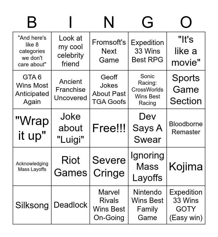 This bingo card has a free space and 33 words: Big Crossover, Wolverine/Spider-man (Insomniac), Joke about "Luigi", Celebrity Announcer Clearly Doesn't Care, Acknowledging Mass Layoffs, Ancient Franchise Uncovered, "It's like a movie", Silksong, Look at my cool celebrity friend, Rando Interrupting, Geoff Jokes About Past TGA Goofs, Fromsoft's Next Game, Titanfall 3, Muppet, Dev Says A Swear, Sports Game Section, Deadlock, "Wrap it up", Riot Games, Ignoring Mass Layoffs, Severe Cringe, Something Pokemon, "And here's like 8 categories we don't care about", Bloodborne Remaster, Marvel Rivals Wins Best On-Going, Expedition 33 Wins GOTY (Easy win), Expedition 33 Wins Best RPG, Sonic Racing: CrossWorlds Wins Best Racing, GTA 6 Wins Most Anticipated Again, Kojima, Capcom does something with another old IP, Nintendo Wins Best Family Game and FF7 Part 3 Teaser.